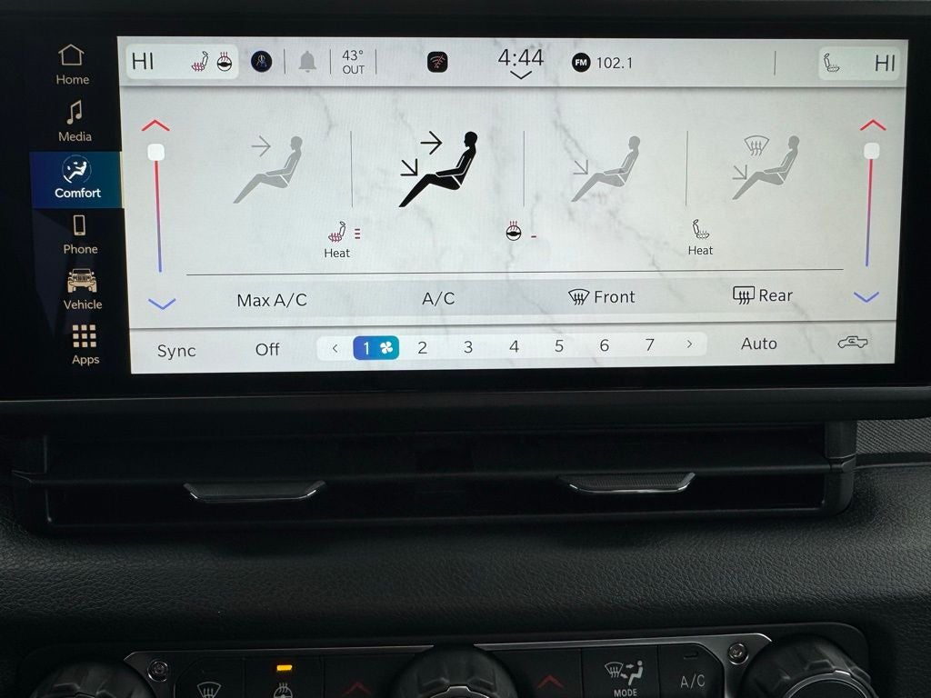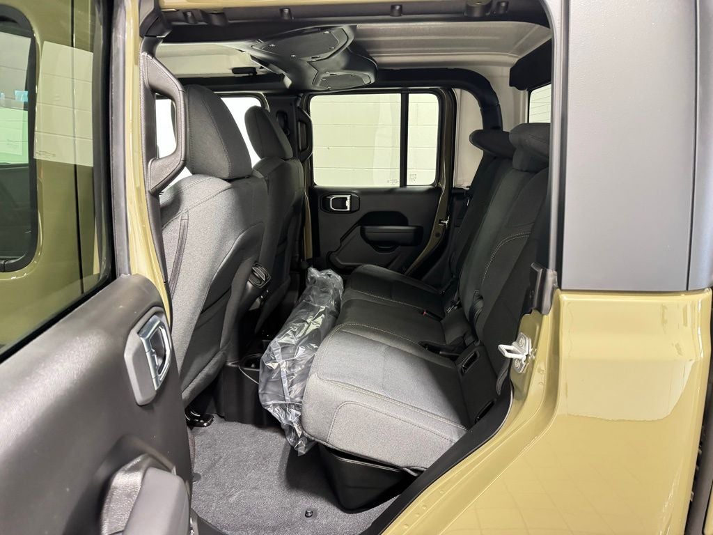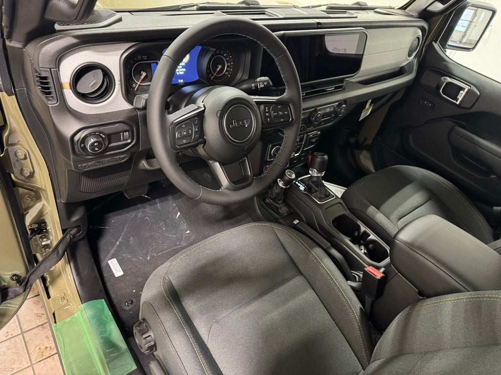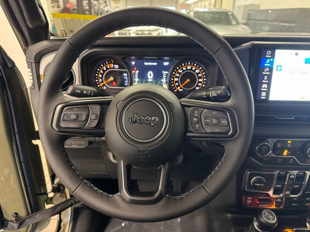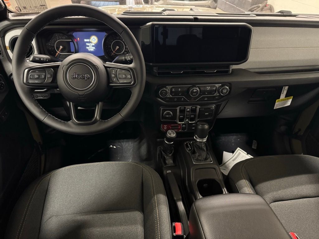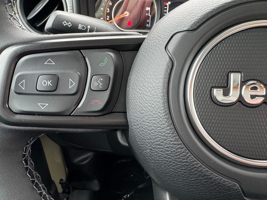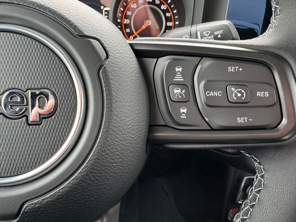 Inside, the cabin balances utility and comfort with automatic climate control, premium-wrapped steering wheel, deep-tint windows, power-heated mirrors, and passive entry. Convenience upgrades include sun visors with illumination, all-weather Mopar slush mats, automatic headlamps, selectable terrain systems, and supportive seating designed for long-distance drives or trail days.