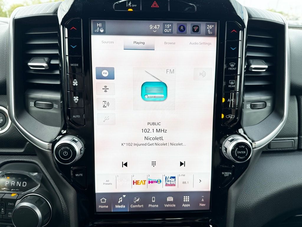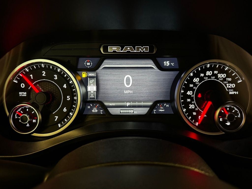 The Uconnect 5 Nav system with a 12-inch touchscreen integrates navigation, SiriusXM 360L, connected travel and traffic services, and smartphone connectivity for seamless control of your drive. A 9-speaker amplified audio system with subwoofer fills the cabin with rich sound, while multiple power outlets, including a 115-volt auxiliary rear outlet, ensure you stay connected and powered on the go. Additional interior touches like a universal garage door opener, automatic-dimming rearview mirror, in-floor storage bins, and front seat-back map pockets reflect Rams thoughtful design approach.