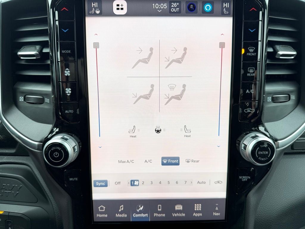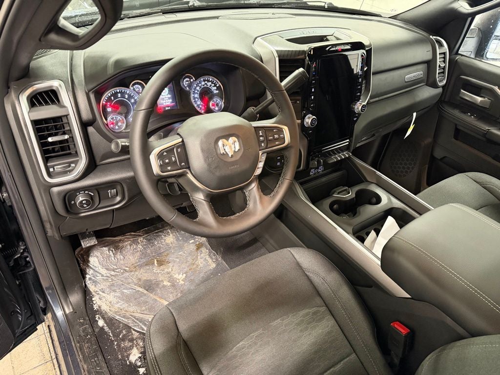The Big Horn Level 1 Plus Equipment Group elevates the interior with premium cloth bucket seating, power-adjustable driver controls, and added convenience features designed to make long days behind the wheel more comfortable. Heated front seats and a heated steering wheel help keep you warm during cold Buffalo winters, while Mopar front and rear rubber floor mats protect the cabin from snow, dirt, and debris. A spacious Crew Cab layout provides generous rear-seat legroom and versatility for passengers or gear.
