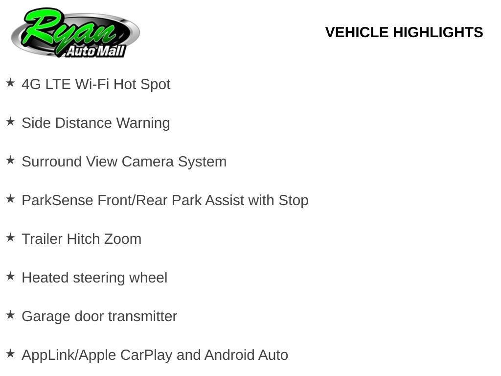Safety and driver assistance are key highlights, with a comprehensive suite of advanced features designed to support confidence behind the wheel. Adaptive cruise control with stop and go, active lane management, and full-speed forward collision warning with intersection collision assist help you stay aware of traffic conditions. Blind-spot monitoring, cross-path detection, traffic sign recognition, and ParkSense front and rear park assist provide additional support in busy environments, while automatic high-beam headlamp control enhances nighttime visibility.