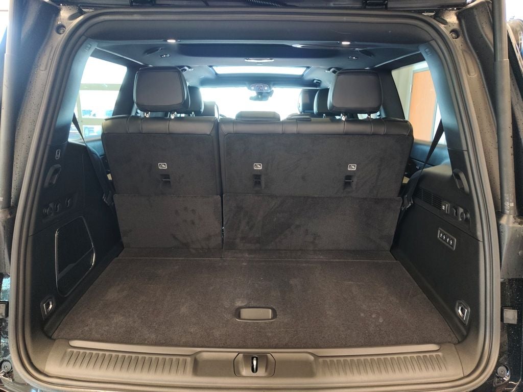 The exterior is finished in striking high-gloss black and enhanced by the Black Appearance Package, 22-inch gloss-black painted wheels, and power-deployable running boards that provide both bold style and everyday convenience. The tri-pane panoramic sunroof spans multiple rows, filling the cabin with natural light and creating an open, upscale atmosphere for every passenger.