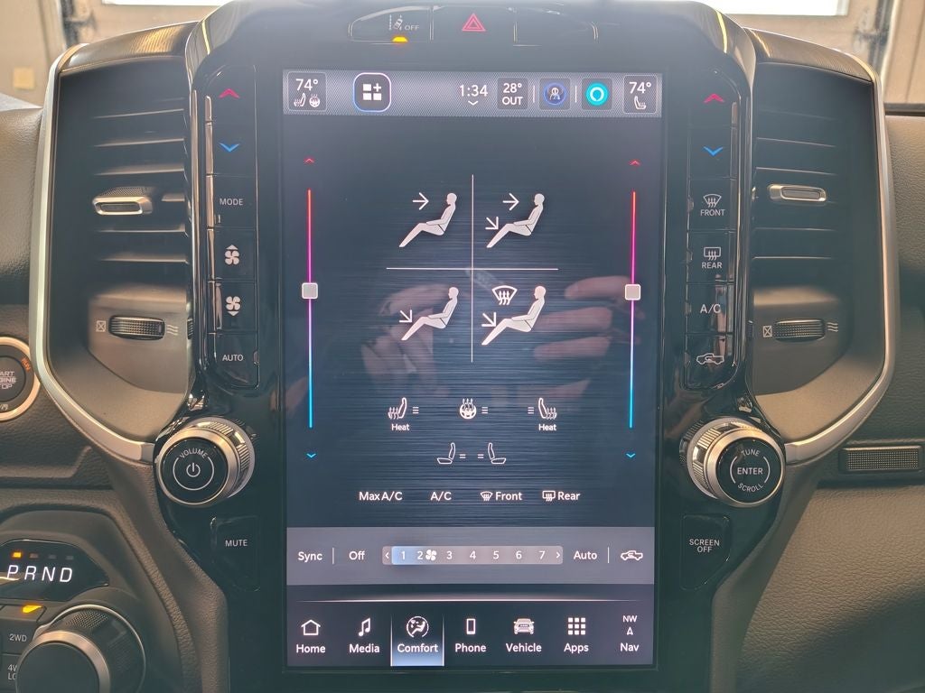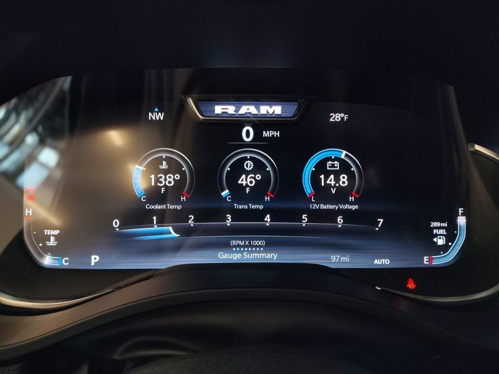 Inside, the Big Horn Level 2 Equipment Group transforms the cabin into a comfortable and connected workspace. Heated front seats, a heated leather-wrapped steering wheel, power-adjustable pedals, and dual-zone automatic climate control keep you comfortable in every season. The 12-inch TFT digital cluster and Uconnect 5 navigation system with a large 12-inch touchscreen provide intuitive access to navigation, media, and vehicle settings, while the 9-speaker amplified audio system with subwoofer delivers rich sound throughout the spacious crew cab.
