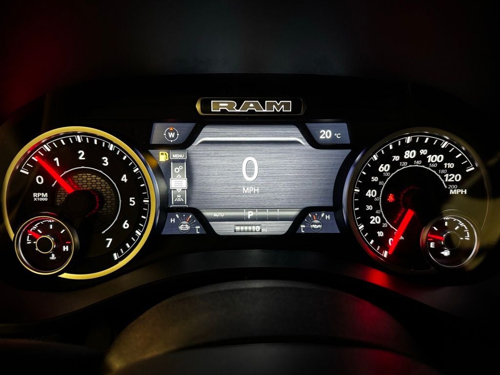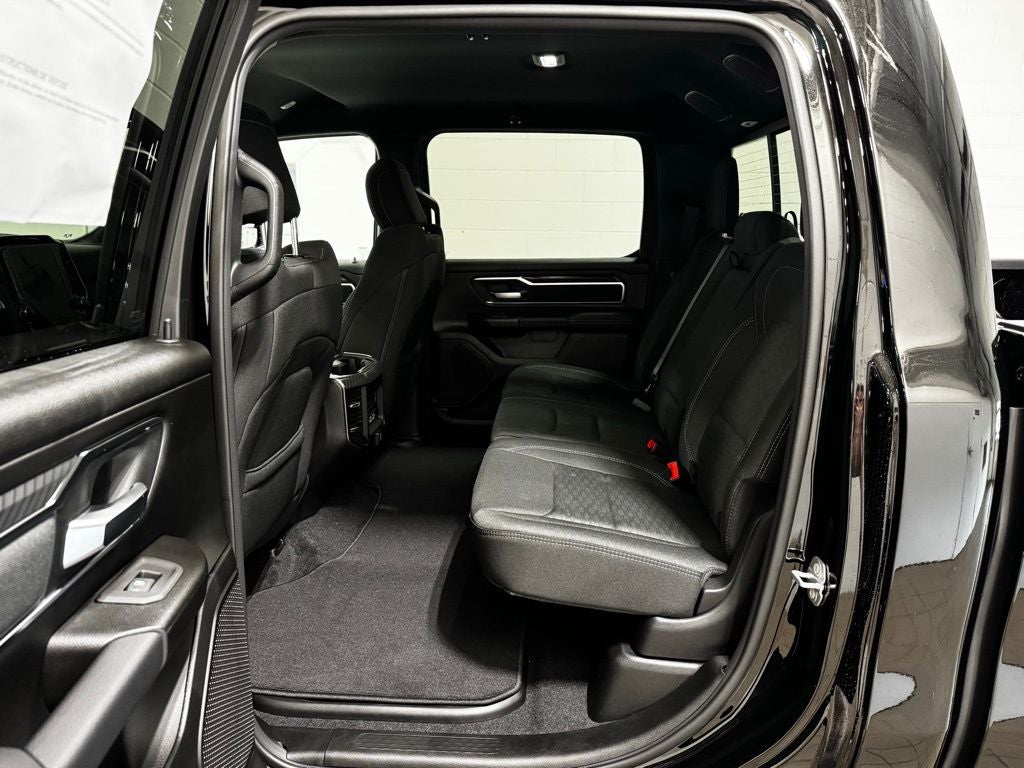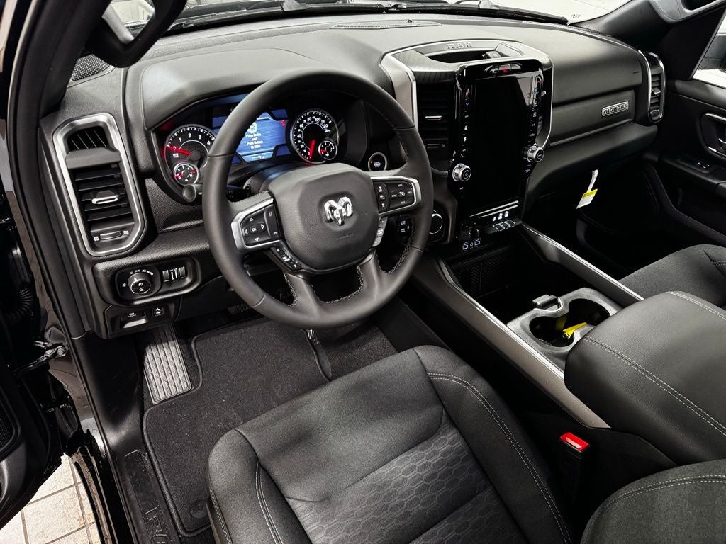 Inside, the spacious Crew Cab configuration delivers impressive comfort and versatility. The Big Horn Level 2 Equipment Group adds heated front seats, a heated leather-wrapped steering wheel, dual-zone automatic climate control, and an eight-way power driver seat with lumbar adjustment for personalized comfort during long drives. Rear passengers benefit from 60/40 folding seats and in-floor storage bins, making it easy to carry both passengers and gear. Technology is front and center with Uconnect 5 NAV and a 12-inch touchscreen display, offering navigation, SiriusXM 360L, smartphone integration, Connected Travel and Traffic Services, and a 400-watt inverter for powering tools and devices. The premium nine-speaker amplified sound system with subwoofer delivers crisp, powerful audio throughout the cabin. Additional conveniences include a power tailgate release, rear power-sliding window, automatic-dimming rearview mirror, universal garage door opener, and multiple 115-volt auxiliary power outlets.