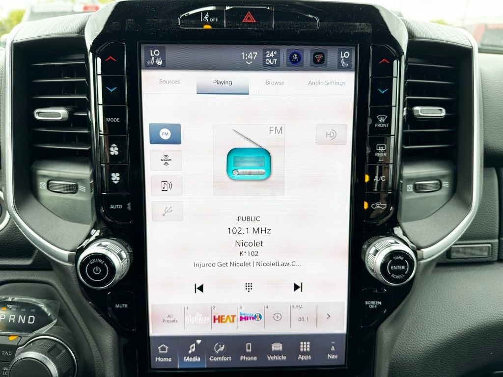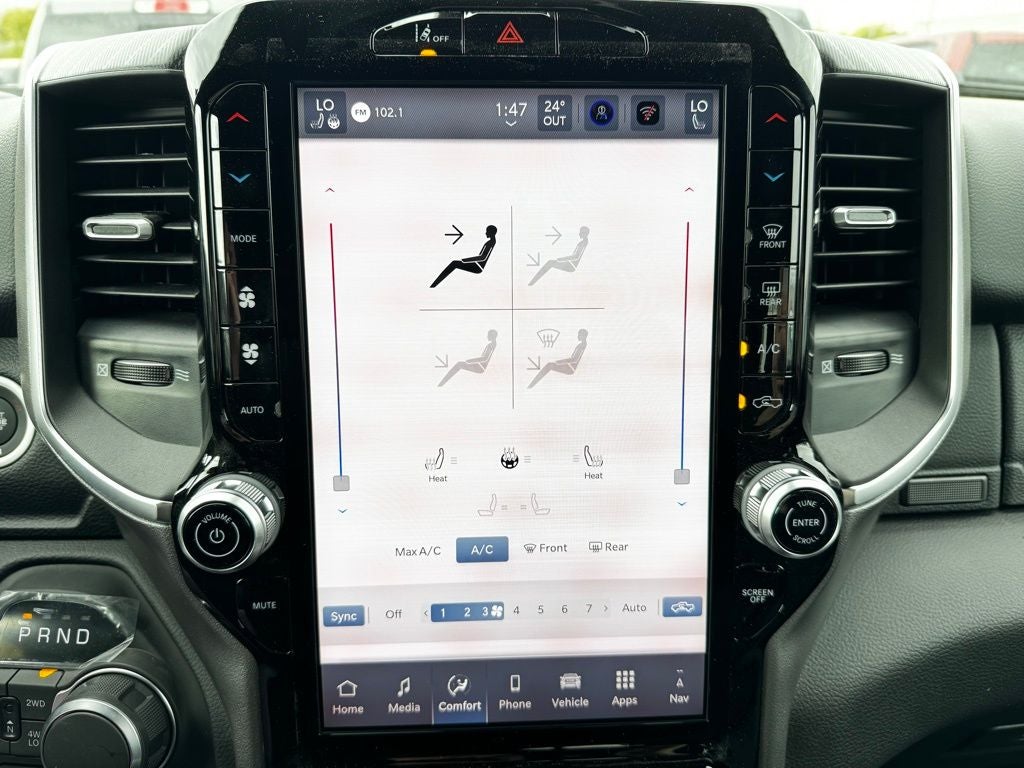 Inside, the Big Horn Level 2 Equipment Group elevates everyday driving with heated front seats, a heated leather-wrapped steering wheel, and an eight-way power adjustable driver seat with lumbar support. Rear passengers benefit from a 60/40 split-folding seat and convenient second-row in-floor storage bins. Dual-zone automatic climate control, a rear center armrest, and a power-sliding rear window add to the trucks comfort and versatility. Technology takes center stage with the Uconnect 5 NAV system displayed on a 12.0-inch touchscreen, delivering navigation, smartphone connectivity, SiriusXM 360L, and Connected Travel and Traffic Services. A digital 7.0-inch cluster display and nine-speaker amplified sound system with subwoofer further enhance the driving experience.