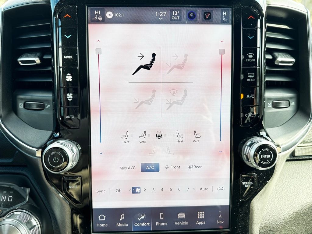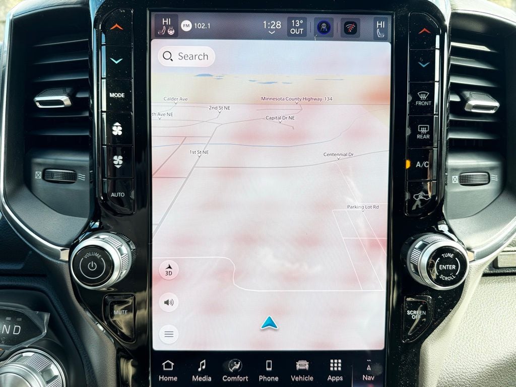 Inside, the 2026 Ram 1500 Laramie Crew Cab 4x4 surrounds you with luxury. The interior features soft-touch materials, detailed stitching, and genuine aluminum accents for a first-class experience. Heated and ventilated front seats, a heated steering wheel, and power-adjustable front seating with memory settings ensure personalized comfort through every Minnesota season. The Laramie Level 1 Equipment Group adds even more convenience with rain-sensitive windshield wipers and a power tailgate release, making this truck as functional as it is refined.