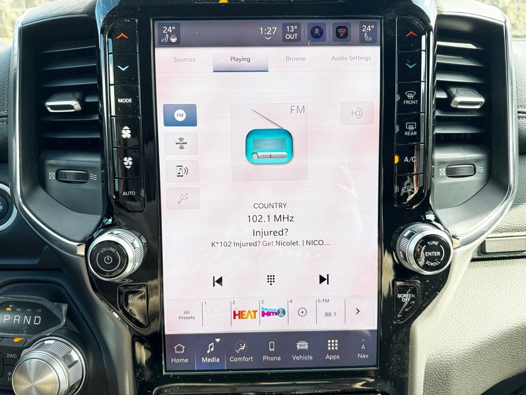 Technology is at the heart of the Ram 1500 Laramie experience. The Uconnect 5 NAV infotainment system with a 12-inch touchscreen display offers wireless Apple CarPlay, Android Auto, and navigation integration for seamless connectivity on the go. A 7-inch driver information digital display keeps essential performance and navigation data front and center, while premium audio options provide crisp, immersive sound throughout the cabin.