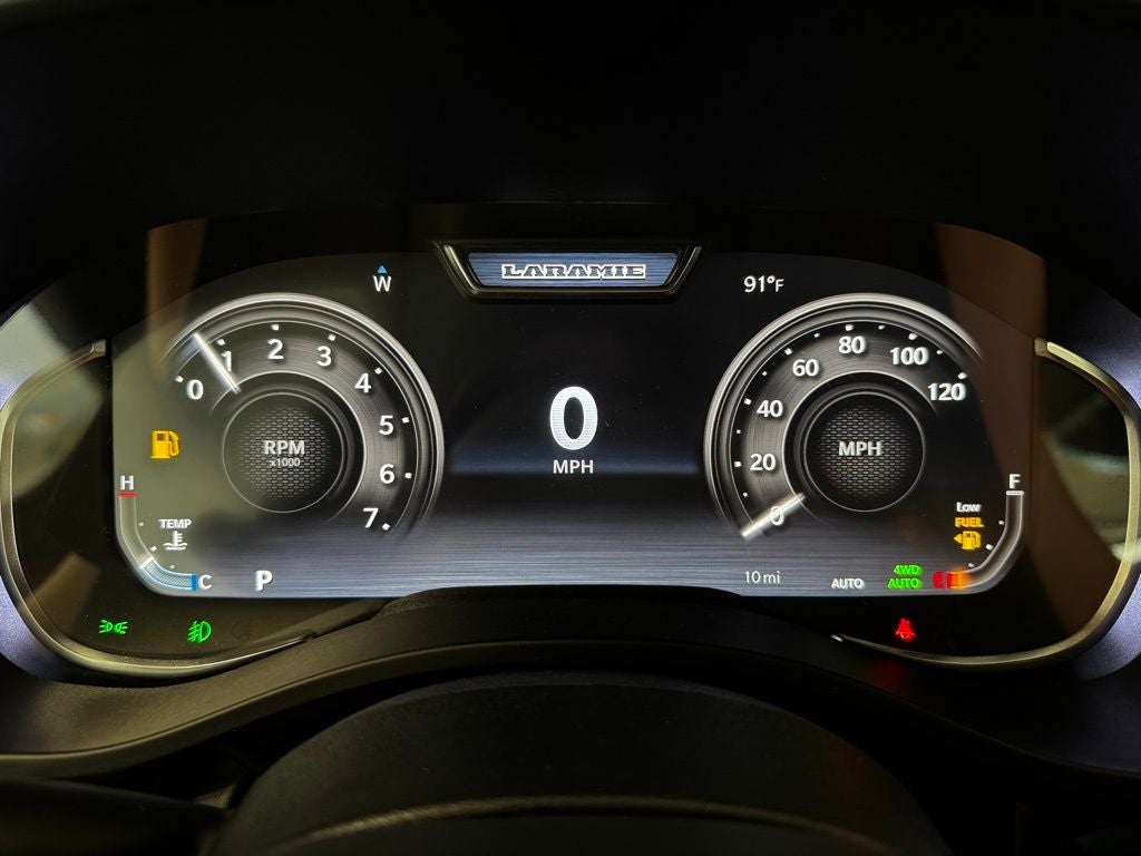 Inside, the cabin becomes a high-end hub with the Laramie Level 2 Equipment Group. A sweeping 12-inch TFT digital cluster transitions seamlessly into a 14.4-inch Uconnect NAV touchscreen that manages navigation, wireless Apple CarPlay and Android Auto, and vehicle settings. A 19-speaker Harman Kardon audio system surrounds occupants in concert-quality sound, while a front-passenger interactive display offers secondary screen control. When storms roll in off Buffalo Lake, rain-sensitive wipers maintain visibility, and a dual-pane panoramic sunroof brightens the cabin on summer drives. A thoughtfully placed power tailgate adds functionality to full-length upgraded console storage, while a powerful 3.92 rear axle ratio and factory trailer-brake controller make towing trailers or campers effortless. A 33-gallon fuel tank extends your range across greater Minnesota routes without frequent stops.