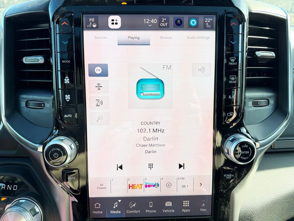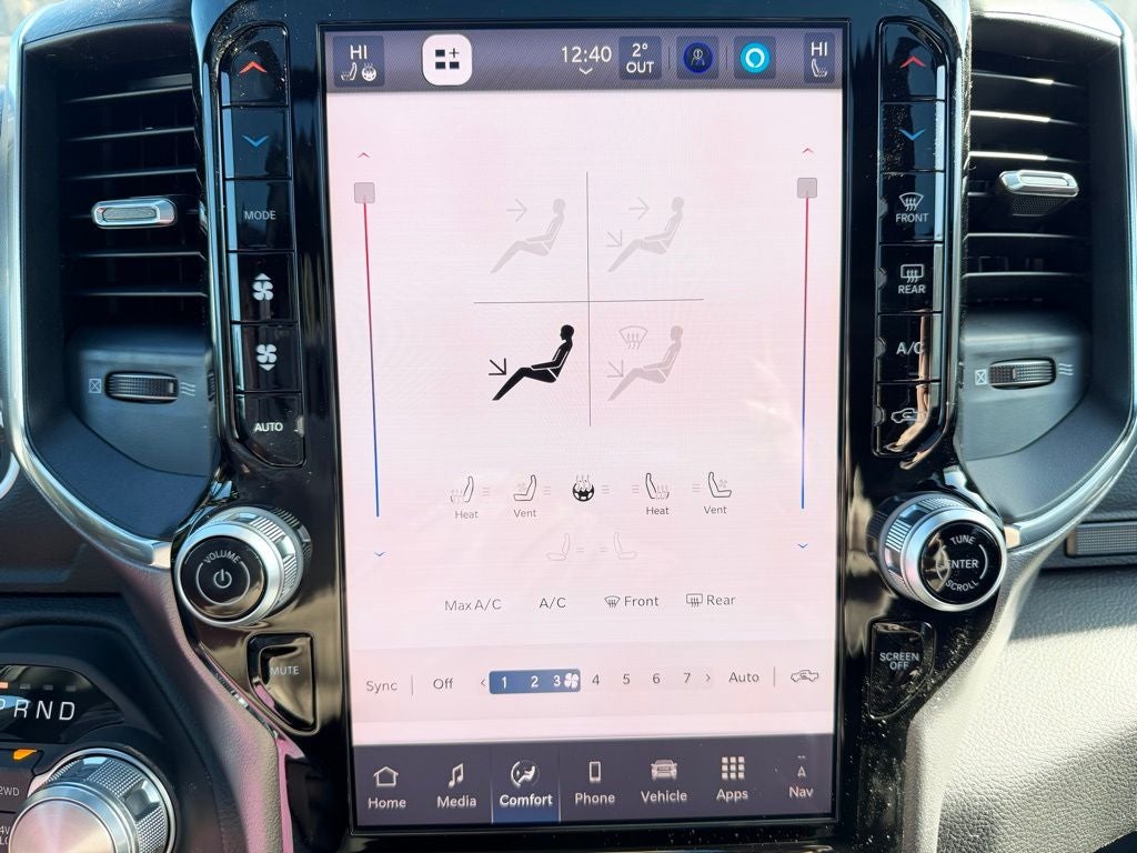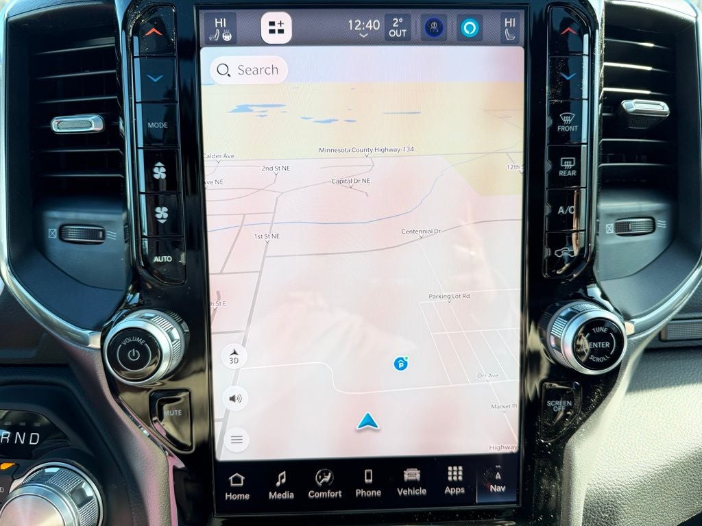 Inside, the Laramie cabin offers a first-class experience with leather-trimmed seating, a power-adjustable drivers seat with memory, heated and ventilated front seats, a heated steering wheel, and dual-zone automatic climate control for year-round comfort. The advanced Uconnect infotainment system features a large touchscreen display with integrated navigation, wireless Apple CarPlay and Android Auto compatibility, Bluetooth® connectivity, and multiple USB ports to keep every passenger connected. A digital instrument cluster and rain-sensitive windshield wipers enhance visibility and confidence in changing weather conditions.
