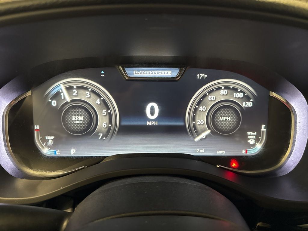 This Ram is further enhanced with the Night Edition package, adding bold exterior styling elements such as blacked-out 22-inch forged aluminum wheels, a sport performance hood, body-color bumpers, and premium power mirrors with approach and departure lighting. The Laramie Level 2 Equipment Group brings a large 14.4-inch touchscreen with built-in navigation, a front passenger interactive display, a 19-speaker Harman Kardon premium audio system, rain-sensing windshield wipers, and a full-color 12-inch digital instrument cluster. Additional highlights include a dual-pane panoramic sunroof that fills the cabin with natural light, power deployable running boards for easy entry, a power tailgate, and a trailer brake controller for confident towing. A 3.92 rear axle ratio and anti-spin rear differential further enhance capability and control.