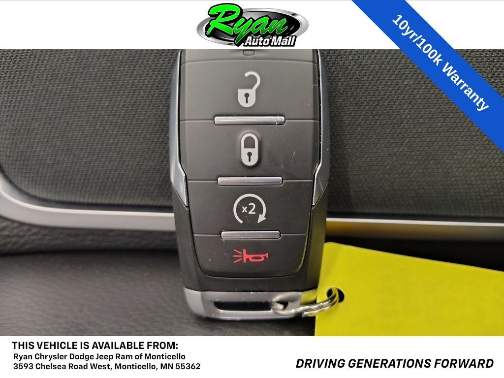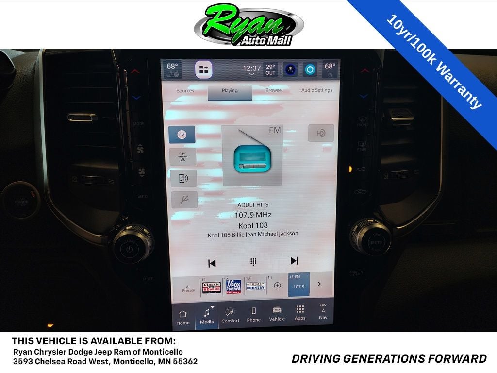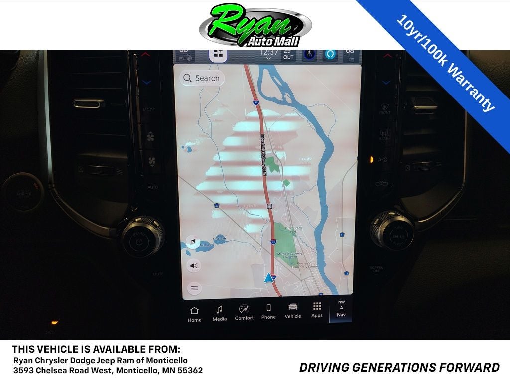 Inside the spacious Crew Cab, the Big Horn Level 1 Plus Equipment Group delivers comfort and functionality with premium cloth bucket seats, heated front seats, a heated steering wheel, dual-zone automatic climate control, an 8-way power-adjustable driver seat, and second-row in-floor storage bins. The Uconnect 5 NAV system with a large 12-inch touchscreen provides navigation, connected services, and intuitive access to vehicle settings, while a 9-speaker Alpine audio system with subwoofer ensures impressive sound quality on every drive.