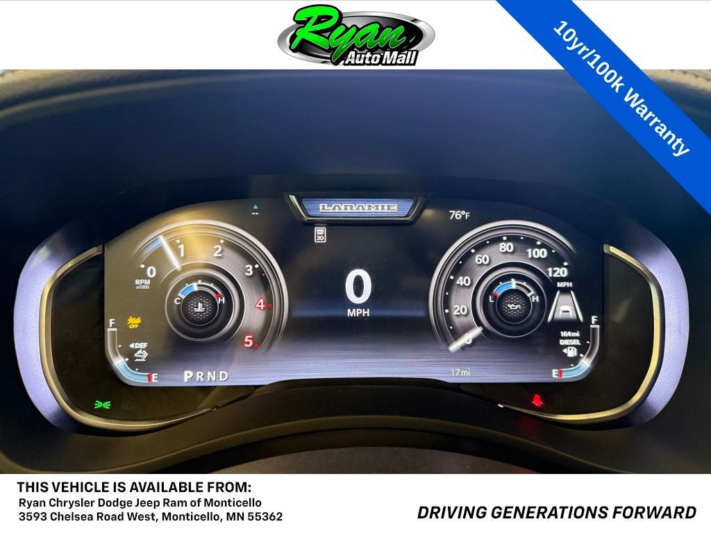 Inside, the Laramie Night offers an upscale yet functional cabin with leather-trimmed bucket seats, a power sunroof, and second-row in-floor storage bins for added practicality. The Laramie Level 1 Plus Equipment Group enhances the driving experience with dual wireless charging pads, adaptive steering, power-adjustable pedals with memory, traffic sign recognition, drowsy driver detection, and active lane-management for added safety and comfort. Cold-weather capability is enhanced by the Mopar winter front grille cover and engine block heater, ensuring reliable performance in Minnesota winters.