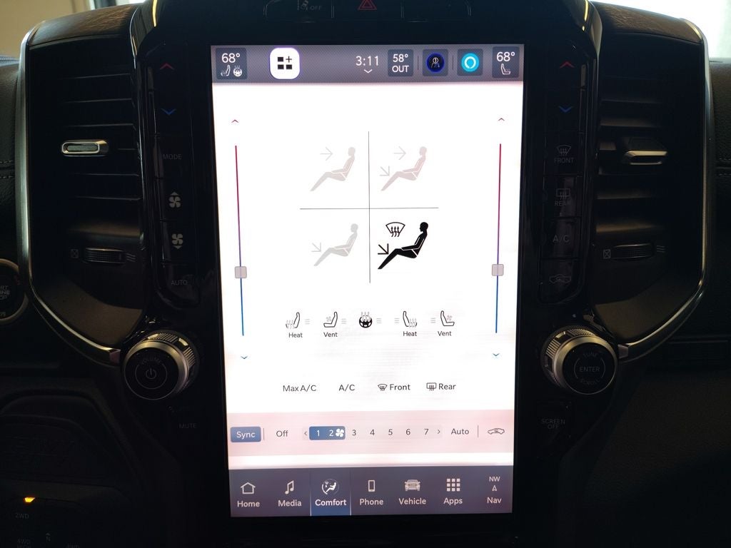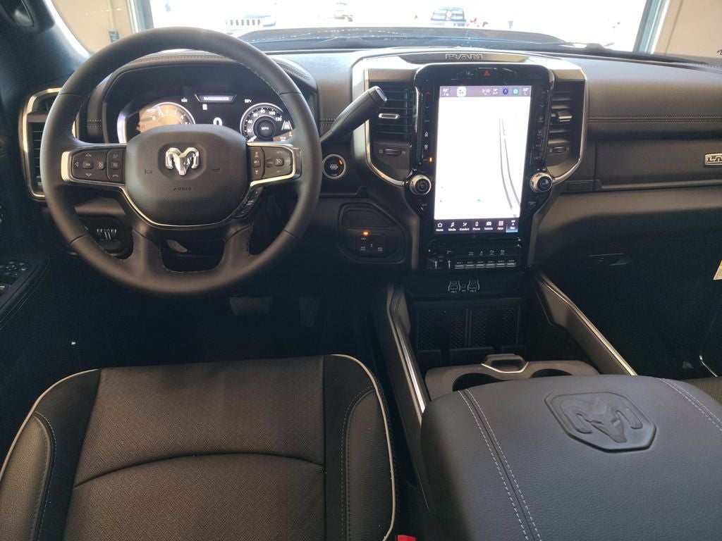 Inside the spacious Crew Cab, the Laramie Level 1 Plus Equipment Group elevates comfort and technology. Leather-trimmed bucket seats provide premium support, while second-row in-floor storage bins add functional versatility. Power heat, fold, and telescoping memory mirrors with automatic adjust-in-reverse and auto-dimming capability enhance towing visibility. Dual wireless charging keeps devices powered, and rain-sensitive windshield wipers add everyday convenience. Advanced driver assistance technologies including traffic sign recognition, drowsy driver detection, and an active lane-management system help provide added confidence on long drives.
