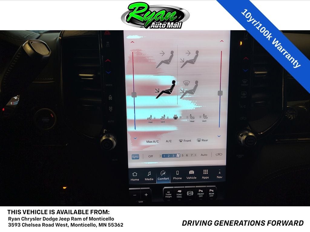 This Limited Night model is finished in Molten Red Pearl-Coat and elevated with the Night Edition, which introduces black 20-inch aluminum wheels, a body-color grille surround, blacked-out trim, and the aggressive Sport Performance Hood for a striking appearance on Monticello roads. The Cold Weather Group adds a winter front grille cover and an engine block heater, ideal for Minnesota winters. The 5th Wheel/Gooseneck Towing Prep Group enhances the trucks built-in towing readiness.