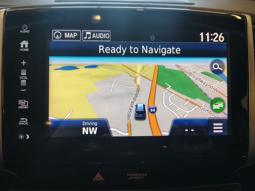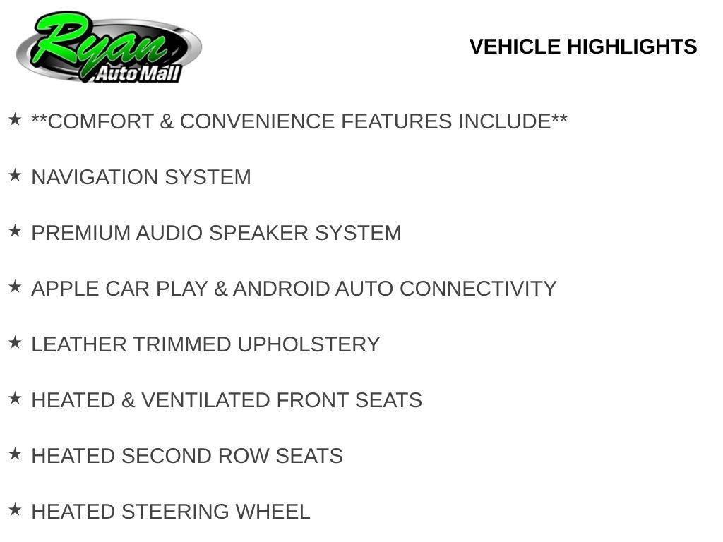 Technology features include an integrated navigation system, a premium audio speaker system, and Apple CarPlay and Android Auto connectivity to keep you connected on the go. A 120-volt power outlet and universal garage door controller add everyday practicality, while the rear window defroster supports cold-weather visibility.