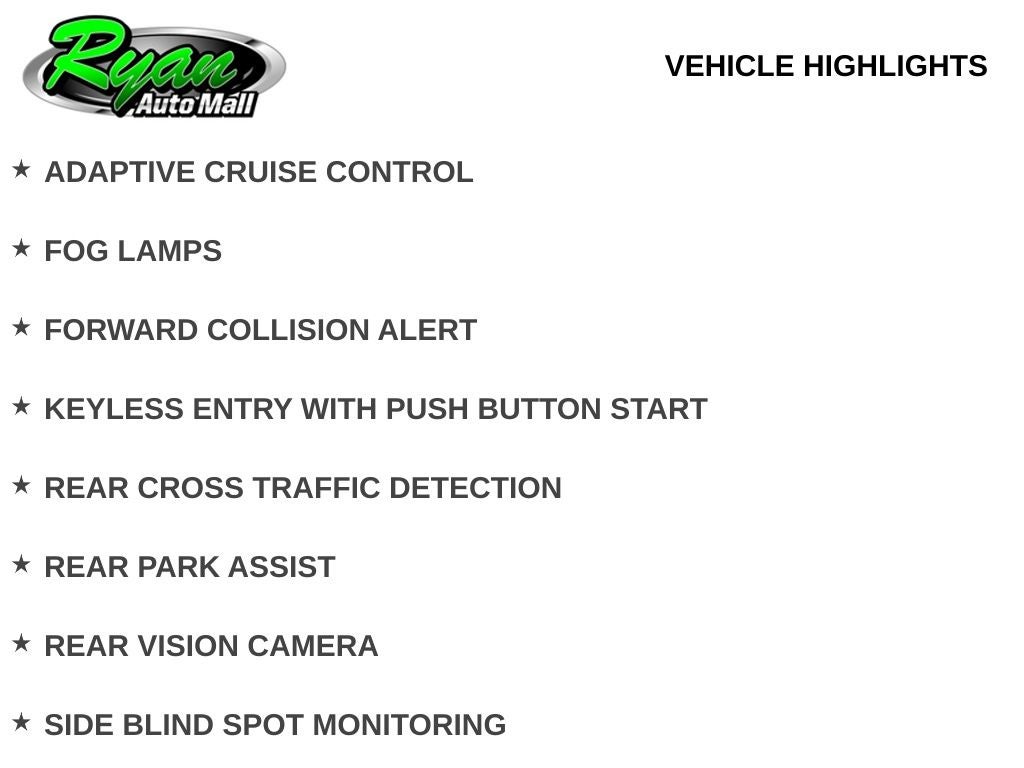 Safety and driver assistance features include adaptive cruise control, forward collision warning, blind spot monitoring, rear cross traffic detection, rear park assist, and a rear vision camera. Fog lamps and keyless entry with push-button start further enhance visibility and ease of use.