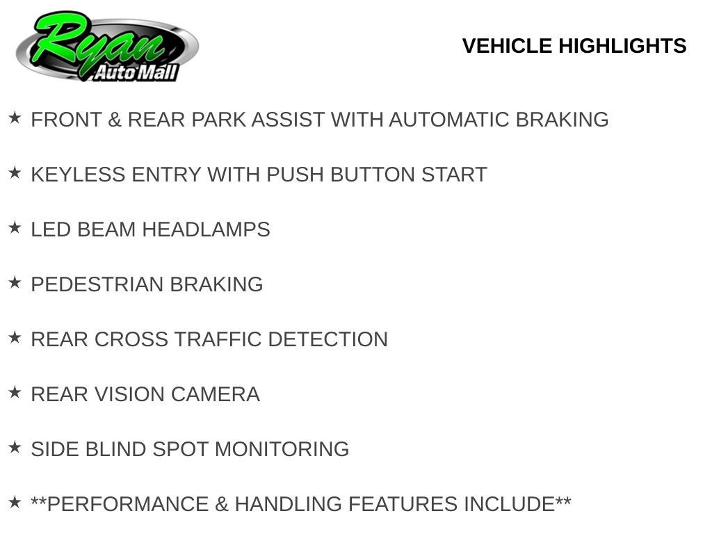 Safety and driver assistance features include forward collision alert, pedestrian braking, blind spot monitoring, rear cross traffic detection, front and rear park assist with automatic braking, LED headlamps, and a rear vision camera, helping provide confidence behind the wheel.