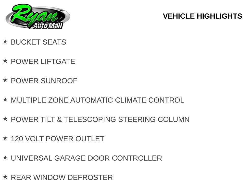 - Driver Convenience Package includes (A2X) 8-way power driver seat adjuster, (KA1) driver and front passenger heated seats, (AL9) power driver lumbar control, (BTV) Remote Start, (TC2) hands-free power programmable liftgate and (KI6) 120-volt power outlet (Includes (V59) Gloss Black roof rails.)