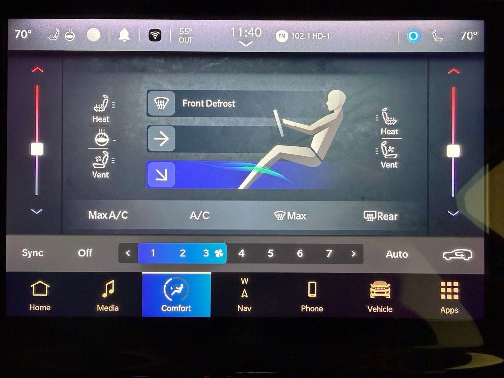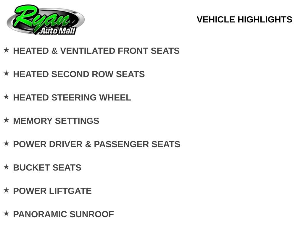 Inside, the cabin offers a refined and spacious environment with synthetic leather upholstery, heated and ventilated front seats, heated second-row seating, and a heated steering wheel for year-round comfort. Power-adjustable front seats with memory settings, a panoramic sunroof, and a hands-free power liftgate add convenience and versatility, while tri-zone automatic climate control keeps all passengers comfortable.