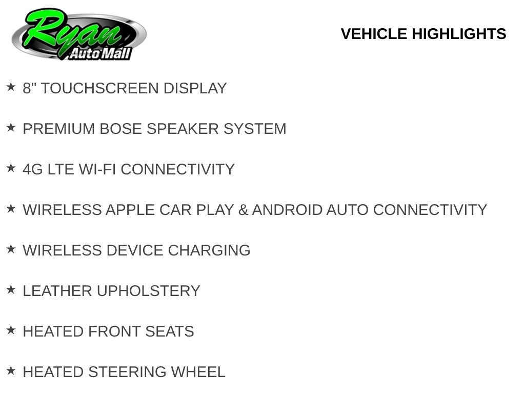 Technology is highlighted by an intuitive infotainment system with an 8-inch touchscreen display, integrated navigation, wireless Apple CarPlay and Android Auto connectivity, wireless device charging, a premium Bose sound system, and available 4G LTE Wi-Fi capability to keep you connected on the go.