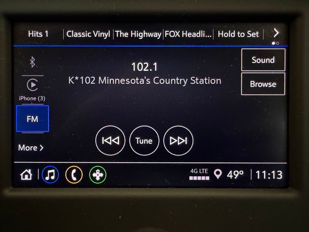 - Audio system, Chevrolet Infotainment 3 system, 7" diagonal color touchscreen, AM/FM stereo. Additional features for compatible phones include: Bluetooth® audio streaming for 2 active devices, voice command pass-through to phone, Apple CarPlay and Android Auto capable.