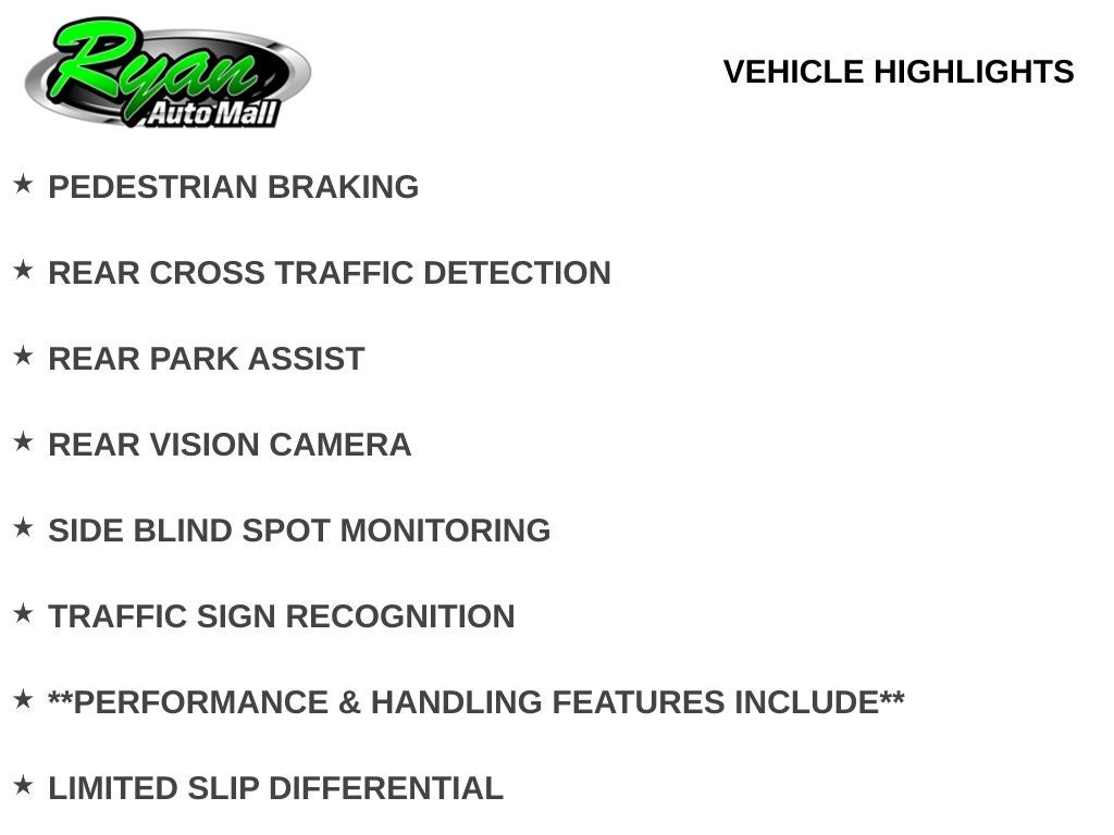 Driver confidence is enhanced with advanced safety features including forward collision alert, pedestrian braking, lane keep assist, traffic sign recognition, automatic high beam headlamps, side blind spot monitoring, rear cross traffic detection, rear park assist, keyless entry with push-button start, and a rear vision camera.