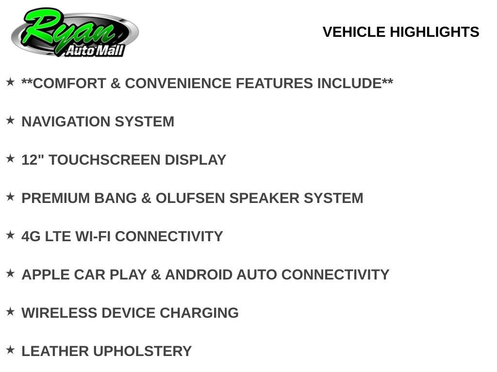 Inside is pure comfort and technology: the 12-inch SYNC 4 touchscreen with navigation, premium B&O® Bang & Olufsen audio, and 4G LTE Wi-Fi hotspot elevate everyday driving. Enjoy seamless smartphone integration via Apple CarPlay and Android Auto, wireless charging, heated and ventilated leather front seats, heated second-row seats, heated steering wheel, memory settings, power-adjustable pedals, power sliding third-row seats, power tilt & telescoping steering column, 120V outlet, universal garage door opener, power liftgate, panoramic Vista roof, multi-zone automatic climate control, rear window defroster, and remote start.