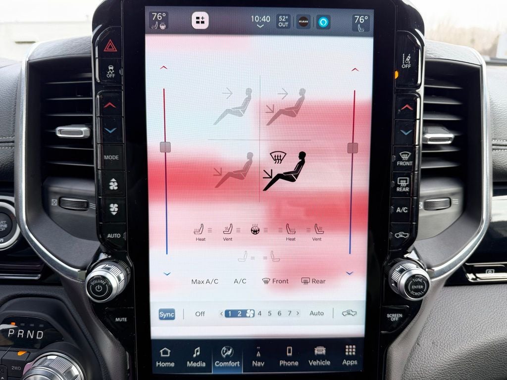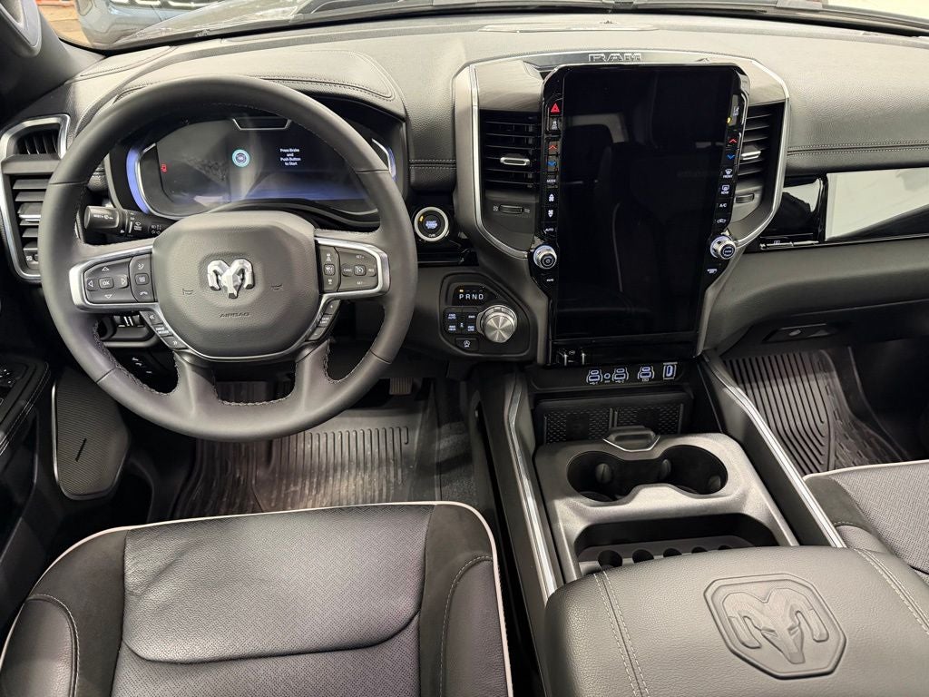 Inside, the Laramie trim features a refined cabin with premium materials and cutting-edge technology. Standard equipment includes a large touchscreen infotainment system with navigation, Apple CarPlay and Android Auto connectivity, and available 4G LTE Wi-Fi capability. This truck is upgraded with the Level 2 Equipment Group, adding an impressive 14.4-inch touchscreen display, front passenger interactive display, and a premium Harman Kardon sound system for an elevated driving experience. Comfort is exceptional with leather-trimmed seating, heated and ventilated front seats, heated second-row seating, a heated steering wheel, power-adjustable seats with memory, and dual-zone automatic climate control.
