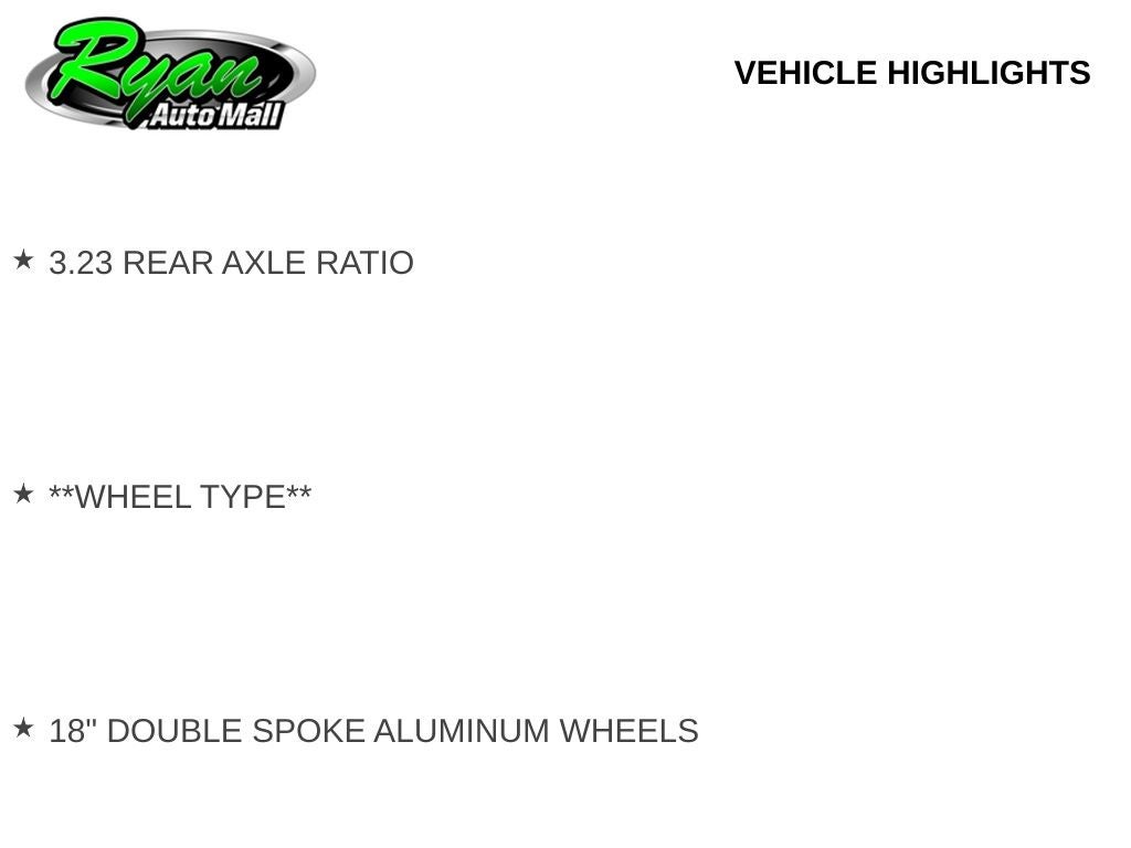 Advanced driver assistance and safety technologies enhance confidence on every drive and include forward collision alert, lane departure warning, side blind spot monitoring, rear cross traffic detection, a rear vision camera, fog lamps, keyless entry with push button start, and a head-up display that projects important driving information directly into the driver’s line of sight. Practical features such as power folding mirrors, a 3.23 rear axle ratio, and stylish 18-inch double spoke aluminum wheels further complement the vehicle’s sophisticated design and balanced performance.